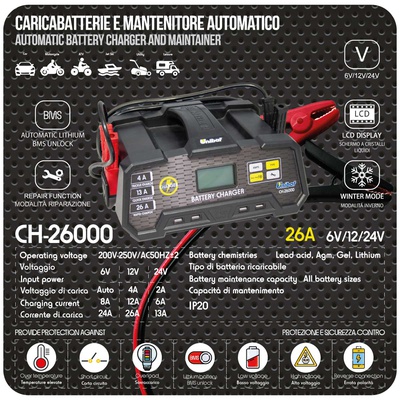 Commutabile per batterie al piombo / AGM / Gel / Litio Uscita: 6V, 12V o 24V commutabile Tensione di funzionamento: 200V-250V/AC50HZ Corrente di carica: 6V - Auto/8A/24A; 12V - 4A/12A/26A; 24V - 2A/6A/13A Display LCD Porte USB DC 5V Modalità inverna